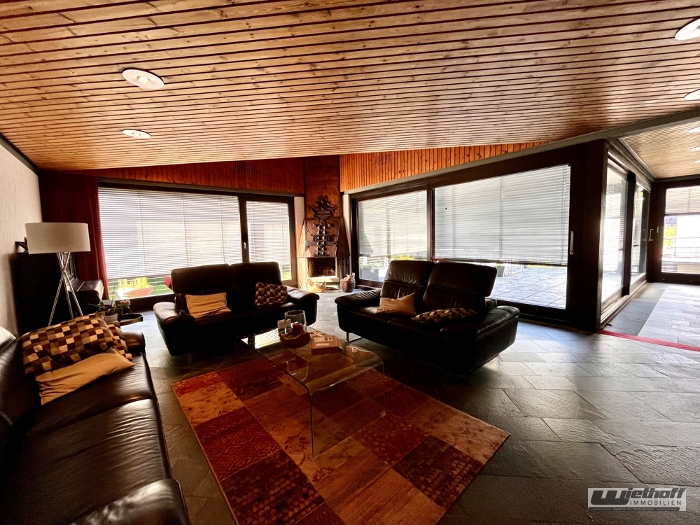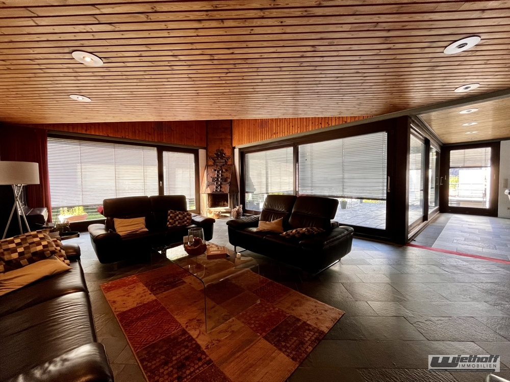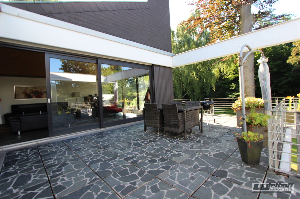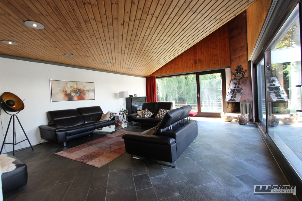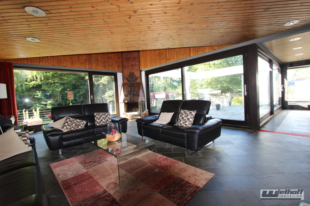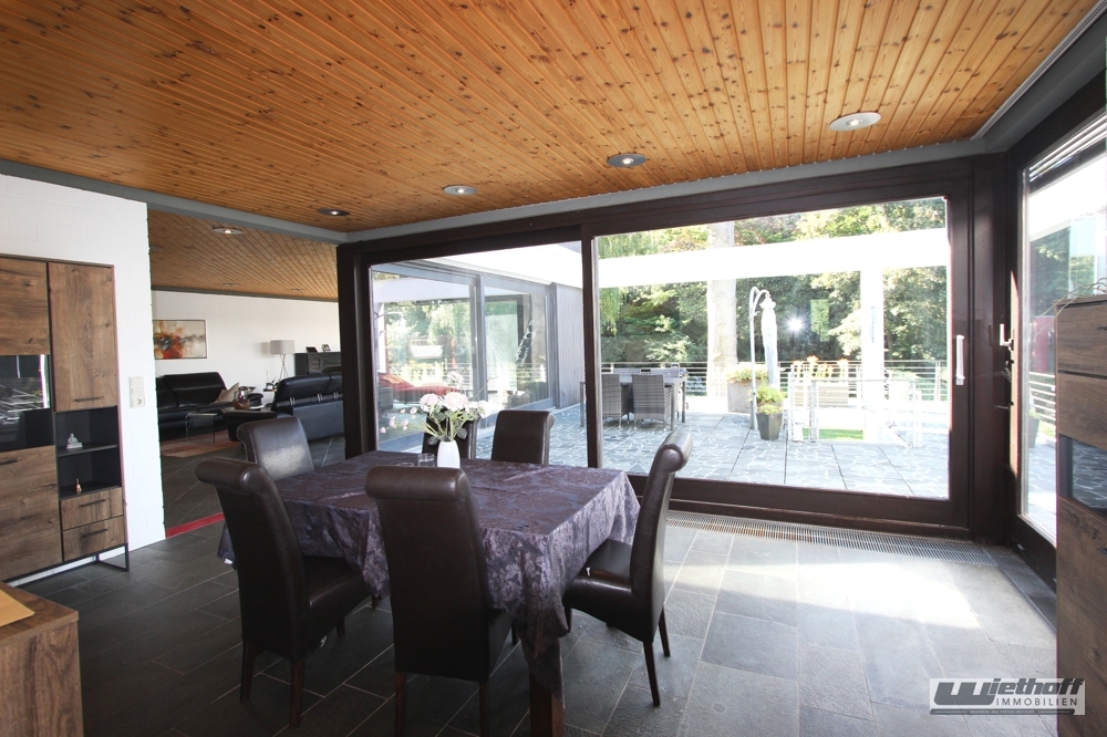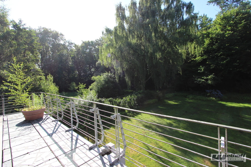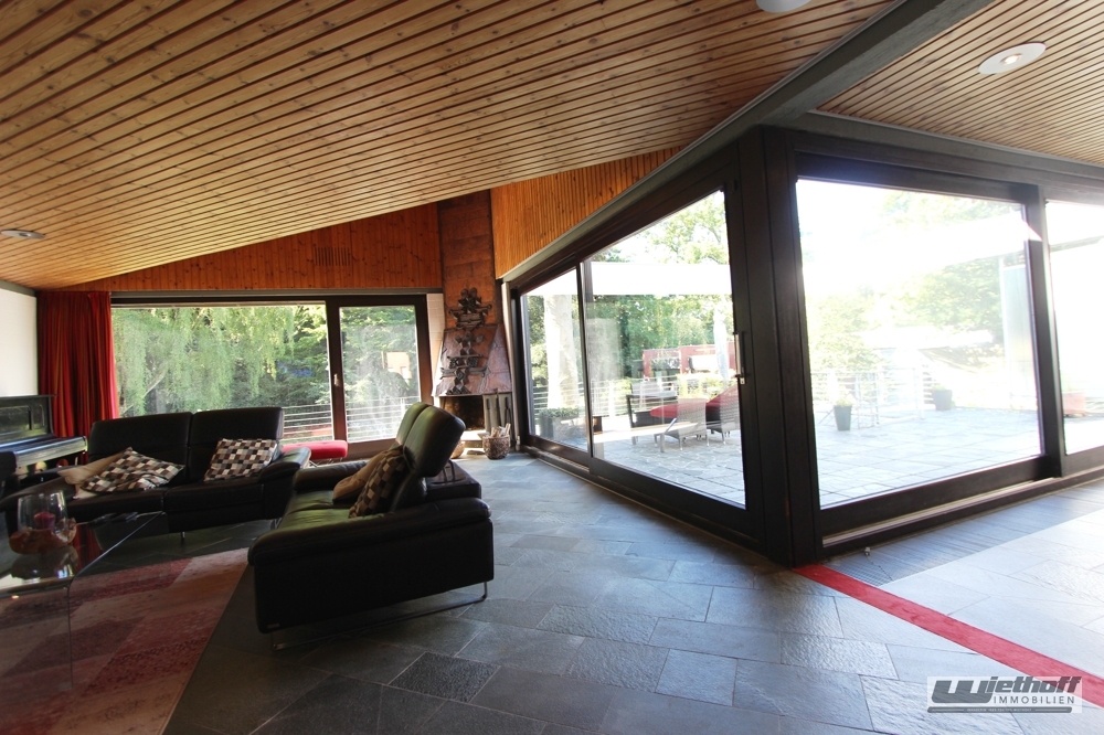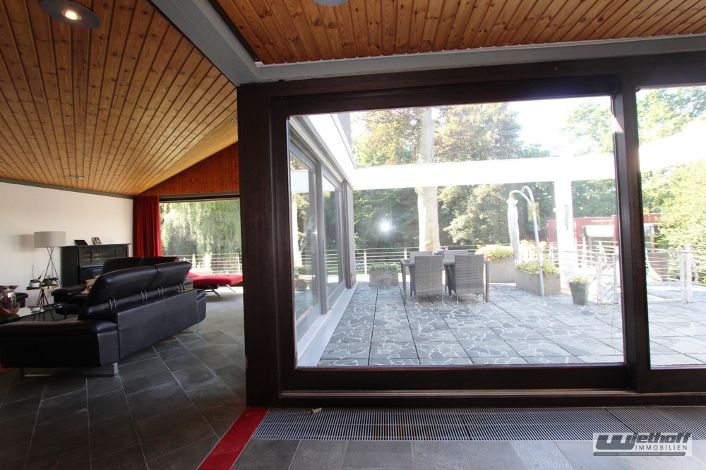 Ein traumhafter Blick bietet sich durch die bodentiefen Fenster - mit Schiebeelementen - in Ihren parkähnlichen Außenbereich.